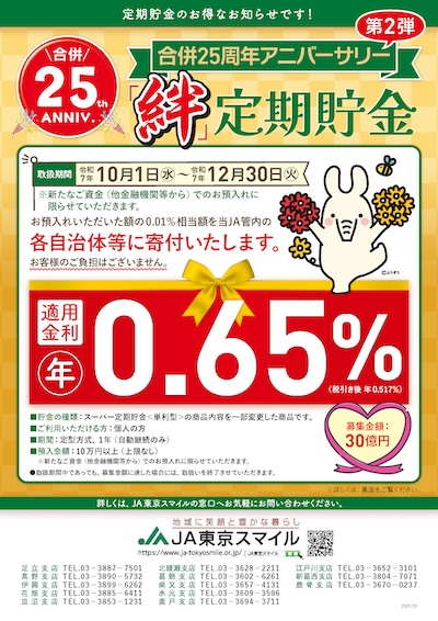 取扱期間中に10万円以上の新たな資金で定期貯金を作成いただいた方に、0.65%の金利を適用いたします。